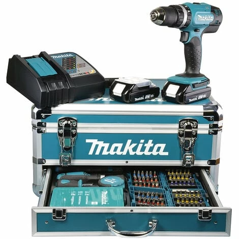 Makita DHP453RFX2 Set Akku-Schlagbohrschrauber 18V, 42 Nm, 0-1.300 min-1 inkl. 2 x Akku, LadegerÀt, Zubehör