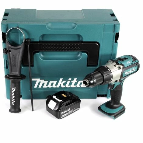 Der Makita DHP 451 ist ein 18 Volt starker, Li-Ion betriebener Akku Schlagbohrschrauber mit einem 3-Gang Vollmetall-Planetengetriebe und abschaltbarem Schlagwerk. Das Drehmoment lässt sich in 16 Stufen und einer separaten Bohrstufe präzise einstellen. Die DHP 451 besitzt zudem einen Rechts-/Linkslauf, einen Zusatzgriff für einen besseren Halt und einen Tiefenanschlag. Die integrierte LED-Leuchte ermöglicht zudem das Arbeiten an schlecht beleuchteten Arbeitsplätzen.
