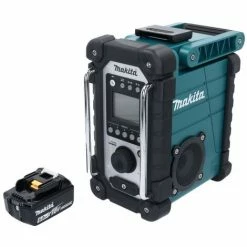 Das DMR 107 Baustellenradio von Makita, ĂĽberzeugt wie immer durch die hohe Klangqualität und das robuste Gehäuse. Das mit einem Tragegriff ausgestattete Gehäuse ist an den äuĂźeren Rändern gummiert und jegliche Ă–ffnungen sind staub- und schmutzfest verschlossen und zusätzlich gegen Spritzwasser geschĂĽtzt ( IP64 ). Ein groĂźes LCD-Display mit Beleuchtung ermöglicht eine einfache manuelle oder vollautomatische Sendereinstellung. Der Sendersuchlauf und die Lautstärkeregelung werden vereinfacht ĂĽber den Drehknopf gesteuert und reduzieren den Umgang mit dem Radio aufs einfachste. Sollte der Musikwunsch nicht im Radio zu finden sein, besitzt das DMR 107 auch einen Aux-Anschluss, um den eigenen iPod oder MP3-Player anzuschlieĂźen. Das Radio kann ĂĽber gängige 7,2 – 18 Volt Makita Einschub- und Aufsteckakkus oder ĂĽber den mitgelieferten Netzadapter betrieben werden. DarĂĽber hinaus verfĂĽgt das Baustellenradio von Makita ĂĽber eine Weckfunktion. Bei dem neuen DMR 107 Baustellenradio können nun auch 10,8 Volt Akkus eingesetzt werden.